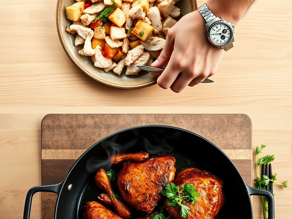 Heat two tablespoons of oil in a skillet until it reaches the smoke point. Add the patted-dry chicken in a single layer. Do not move it for three minutes. Once a crust forms, use tongs to flip the pieces. Pour in half a cup of dry white wine or chicken stock to deglaze the pan, scraping up the browned bits (fond) with a wooden spoon.